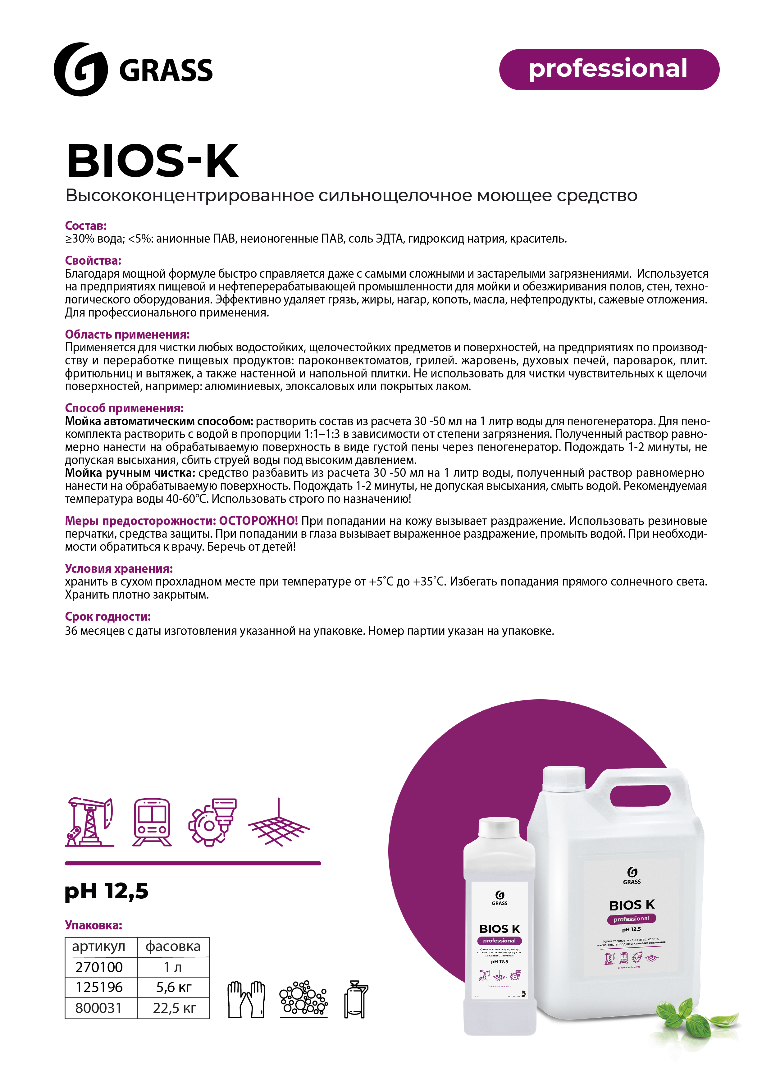Высококонцентрированное щелочное средство Bios K GRASS (канистра 5,6 кг)