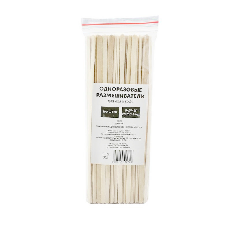 Размешиватель одноразовый деревянный 190 мм 100 штук в упаковке.