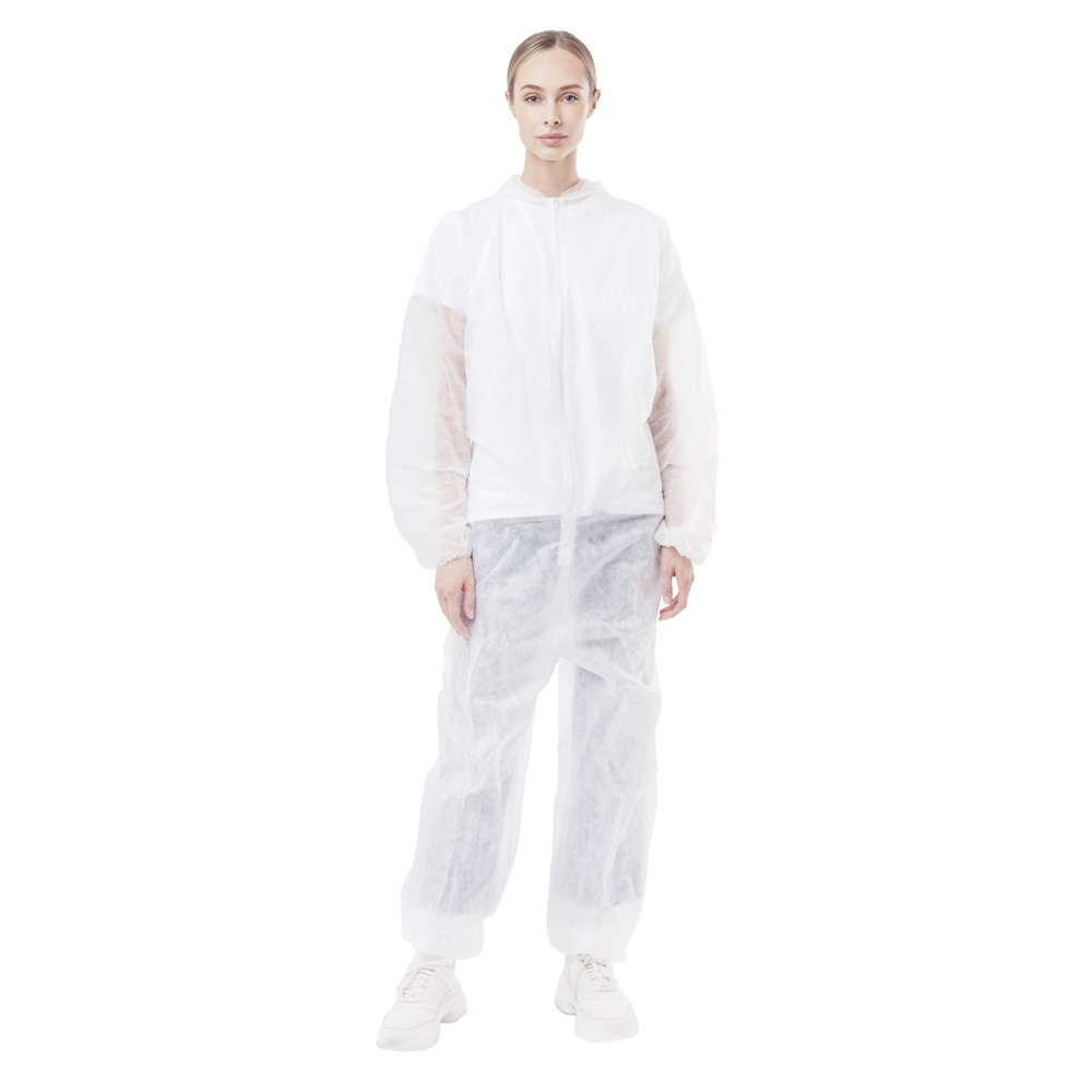 Одноразовый комбинезон Каспер производится из гипоаллергенного нетканого материала спанбонд. Для удобства надевания имеется застежка в виде молнии и защитный капюшон.